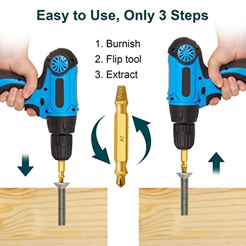 Semplice e pratico: il kit di estrazione delle viti è progettato con design 2 in 1. Con solo due semplici passaggi, il lavoro è fatto. Utilizzare il trapano filettato per lucidare la vite danneggiata e poi utilizzare un altro trapano per rimuovere facilmente la vite.