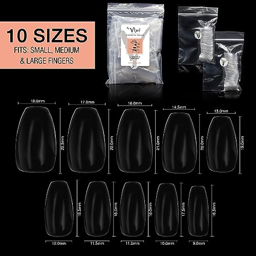 MOLTEPLICI TAGLIE - Copertura totale. Il set Bara/ Ballerina include 10 misure per unghie, contrassegnate dai numeri da 0 a 9, imbustate separatamente per trovare facilmente la dimensione corretta per ciascun dito. Questo set dalle molteplici misure By Vixi è pensato per adattarsi comodamente e perfettamente alle unghie grandi e piccole (fino a 3 manicure).