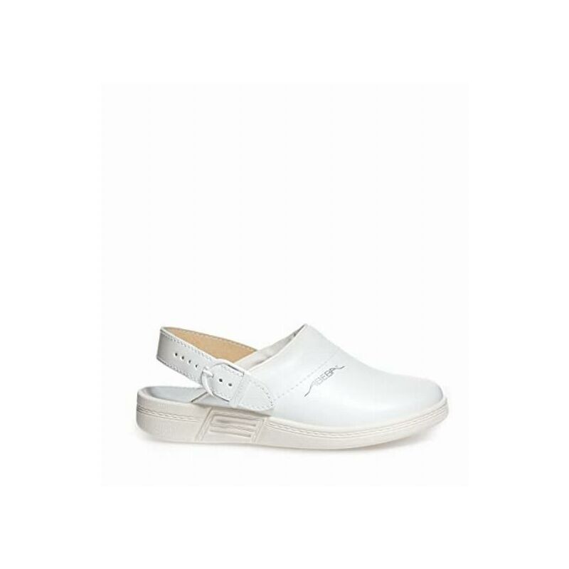 CE EN ISO 20347: 2012 OB A FO SRC pelle liscia bianca Sanitized trattamento (odore e resistenza batterica) prodotta secondo la norma DIN 4843, parte TÜV GS 100 sezione 3.1 V.8/93 Heel strap pieghevole, regolabile ponte macchia pelle