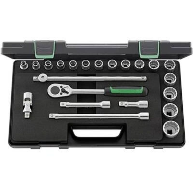 Set di socket 1/2 n. 50/16/6 - Cromo placcato - Acciaio con lega cromata - Inserti a telaio in HPQ® acciaio ad alte prestazioni Consegna: In scatola di plastica ABS impilabile. Contenuto: 1 Maglia a leva 16 inserti a presa a 12 spie 10. 11. 12. 13. 14. 15. 16. 17. 18. 19. 21. 22. 24. 27. 30. 32 mm 3 estensioni 75. 130. 255 mm 1 maniglia trasversale con pezzo scorrevole 1 giunto gimbal