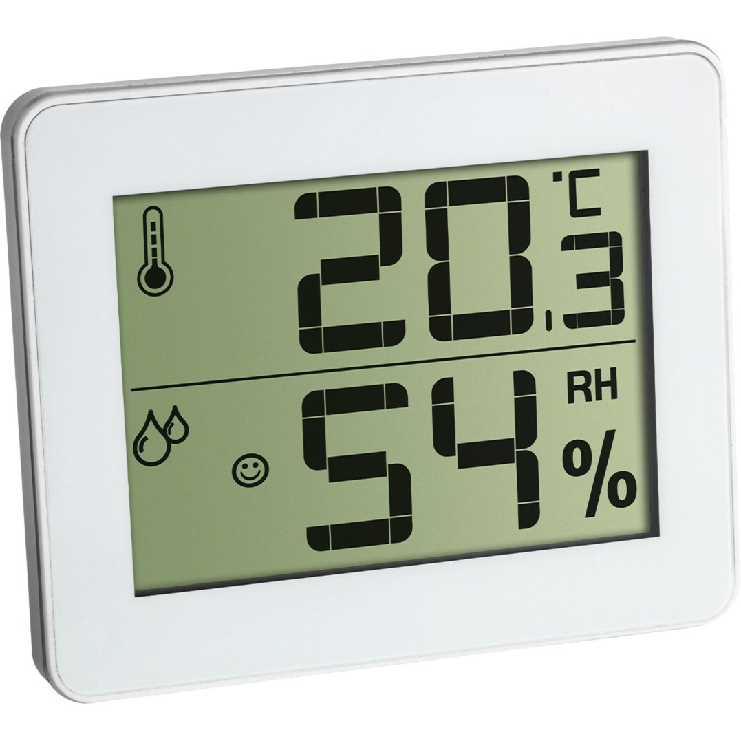 Il termoigrometro digitale 30.5027 di TFA in un design ultrapiatto lucido è uno strumento di misura ideale per il monitoraggio del clima interno. Due terzi della tua vita sono spesi almeno in casa. Se ci sentiamo a nostro agio e a nostro agio lì dipende in larga misura dalla qualità dell''aria della stanza. Le stanze troppo umide favoriscono la formazione di muffe, ma l''aria troppo secca danneggia anche la salute e gli animali domestici, le piante, i pavimenti in legno e i mobili antichi ne soffrono. La temperatura e l''umidità possono ora essere facilmente tenute in vista e regolate da riscaldamento e ventilazione mirati se i valori sono al di fuori della zona di comfort. Se appare una faccina sorridente che ride, i valori sono ottimali. I valori più alti e più bassi vengono salvati e visualizzati con la semplice pressione di un pulsante. In questo modo, è possibile creare un clima di vita piacevole e sano e persino risparmiare sui costi di riscaldamento. L''intervallo di misura della temperatura varia da 0 °C a +50 °C o da -32 °F a +122 °F.