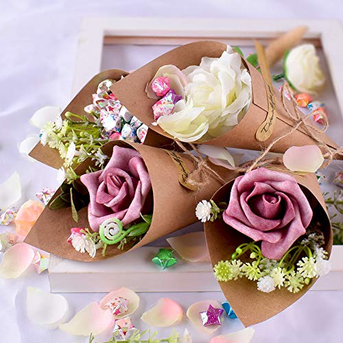【Confezione inclusa】: 50 pezzi coni portariso matrimonio in carta kraft, 50pz corda, 50pz etichetta adesivo e 1 rotolo nastro biadesivo(Non contiene fiori). Hai bisogno di assemblare il coni te stesso.