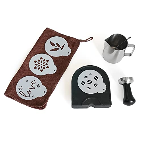 【Set di pressino da 51 mm】 Confezione singola composta da pressino da 51 mm, lattiera da 350 ml, 4 stampini decorativi, 1 tappetino per pressino, 1 penna per latte art e 1 panno in microfibra.