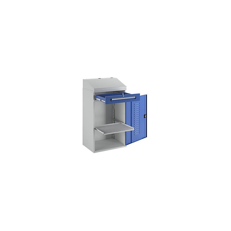 Scrivinpiedi per uso industriale, con 1 cassetto sopra l'armadio, larghezza 650 mm, grigio chiaro / blu genziana. Fornitura = montato. Larghezza totale = 650 mm. Profondità totale = 520 mm. Altezza posteriore = 1200 mm. Altezza anteriore = 1060 mm. Colore scrittoio = grigio chiaro RAL 7035. Serratura = serratura a cilindro con maniglia girevole. Versione = 1 cassetto alto 120 mm, 1 armadio alto 850 mm, con 1 ripiano. Colore corpo = grigio chiaro RAL 7035. Materiale corpo = lamiera d'acciaio, verniciata a polvere. Colore frontalino = blu genziana RAL 5010. Numero cassetti = 1 pz. Interno anta con pannello forato per ganci portattrezzi. Ripiani estraibili e regolabili in altezza. Versione robusta per impiego industriale di lunga durata. Consegnati montati e pronti all'uso! Struttura in lamiera d'acciaio saldata. Verniciatura a polvere, corpo in grigio chiaro RAL 7035. Scrittoio con coperchio ribaltabile e vaschetta portacancelleria. Armadietto con anta a battente completa di serratura