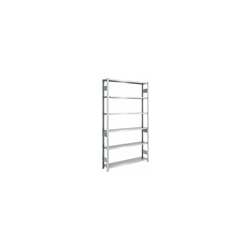 Scaffale a innesto per carichi pesanti, zincato, due lati utili, altezza scaffali 2500 mm, 6 ripiani, scaffale portante, largh. x prof. 1300 x 300 mm. Fornitura = smontato. Tipo di scaffale = scaffale portante. Portata ripiani = 300 kg. Portata campata = 2100 kg. Altezza scaffale = 2500 mm. Larghezza totale = 1360 mm. Materiale = acciaio. Superficie = zincatura. Numero ripiani = 6 pz. Colore montanti = zincatura. Materiale ripiani = acciaio. Colore ripiani = zincatura. Scaffale a innesto per carichi pesanti zincato, con traverse di rinforzo, per impiego su entrambi i lati.