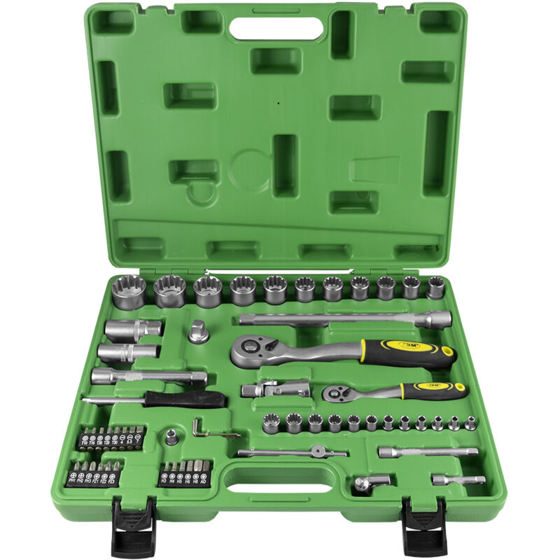 Valigetta portautensili: Bussole scanalate da 12 1/4": 4, 4.5, 5, 5.5, 6, 7, 8, 9, 10, 11, 12, 13 mm Bussole scanalate da 11 1/2": 14, 15, 16, 17, 18, 19, 22, 24, 27, 30, 32 mm 2 bussole candela da 16 e 21 mm 1/2" 2 barre di prolunga da 5" e 10" 1/2" 1 adattatore Tri 1/2 "(M) x 3/8 "(F) Giunto universale da 1 1/2" 2 barre di estensione da 2" e 4" 1 giunto universale da 1/4" 1 impugnatura per cacciavite da 1/4" 1 barra a "T" scorrevole da 1/4" 1 adattatore da 25 mm Punte da 25 mm: Piatta (SL): 4, 5,5, 7 mm Stella (PH): PH1, PHS, PH3 Doppia stella (PZ): PZ1, PZ2, PZ3 Esagonale (HEX): H3, H4, H5, H6, H8 Torx ( TX): T10, T15, T20, T25, T30 3 chiavi a brugola esagonali: 1,5, 2, 2,5 mm 1 1/4" cricchetto da 72 denti 1 1/2" cricchetto da 72 denti