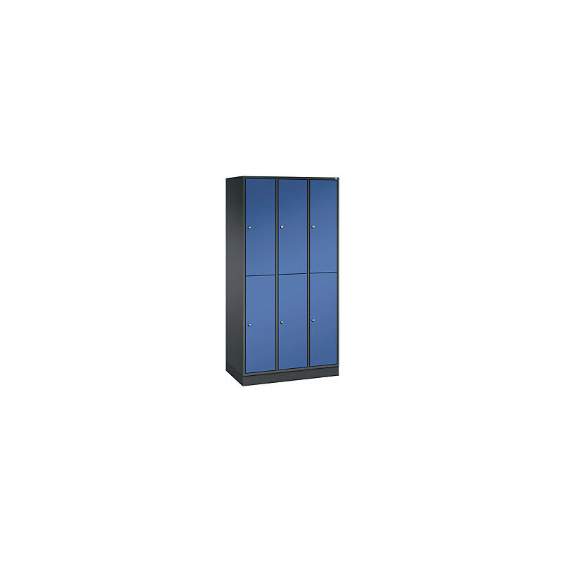 Armadietto guardaroba in acciaio INTRO sovrapposto a due posti, largh. x prof. 920 x 500 mm, 6 scomparti, corpo grigio nerastro, ante blu genziana. Fornitura = montato. Altezza = 1950 mm. Profondità = 500 mm. Larghezza = 920 mm. Colore corpo = grigio nerastro RAL 7021. Colore porta = blu genziana RAL 5010. Serratura = serratura a cilindro differenziata. Numero scomparti in larghezza = 3 pz. Numero scomparti = 6 pz. Larghezza scomparti = 300 mm. Materiale = lamiera d'acciaio. Altezza armadietto = 1950 mm. Dotazione interna = 1 asta appendiabiti, 3 ganci scorrevoli. Larghezza interna = 260 mm. Altezza interna = 895 mm. Profondità interna = 460 mm. Tipo di porta = anta a battente. Numero chiavi = 2 pz. Altezza scomparti = 895 mm. Larghezza ripiani = 260 mm. Profondità ripiani = 500 mm. Altezza zoccolo = 100 mm. Struttura = con saldatura. Superficie = con verniciatura a forno. Struttura in acciaio di lunga durata. Serratura a cilindro con 2 chiavi. Fori di aerazione sulla parete posteriore
