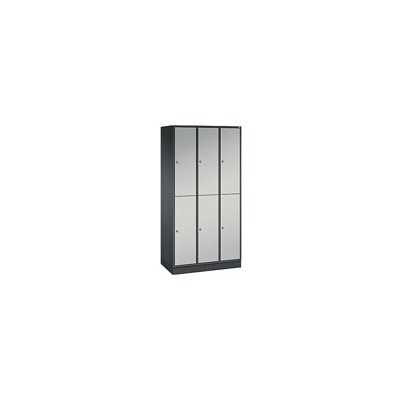 Armadietto guardaroba in acciaio INTRO sovrapposto a due posti, largh. x prof. 920 x 500 mm, 6 scomparti, corpo grigio nerastro, ante alluminio brillante. Fornitura = montato. Altezza = 1950 mm. Profondità = 500 mm. Larghezza = 920 mm. Colore corpo = grigio nerastro RAL 7021. Colore porta = alluminio brillante RAL 9006. Serratura = serratura a cilindro differenziata. Numero scomparti in larghezza = 3 pz. Numero scomparti = 6 pz. Larghezza scomparti = 300 mm. Materiale = lamiera d'acciaio. Altezza armadietto = 1950 mm. Dotazione interna = 1 asta appendiabiti, 3 ganci scorrevoli. Larghezza interna = 260 mm. Altezza interna = 895 mm. Profondità interna = 460 mm. Tipo di porta = anta a battente. Numero chiavi = 2 pz. Altezza scomparti = 895 mm. Larghezza ripiani = 260 mm. Profondità ripiani = 500 mm. Altezza zoccolo = 100 mm. Struttura = con saldatura. Superficie = con verniciatura a forno. Struttura in acciaio di lunga durata. Serratura a cilindro con 2 chiavi. Fori di aerazione sulla