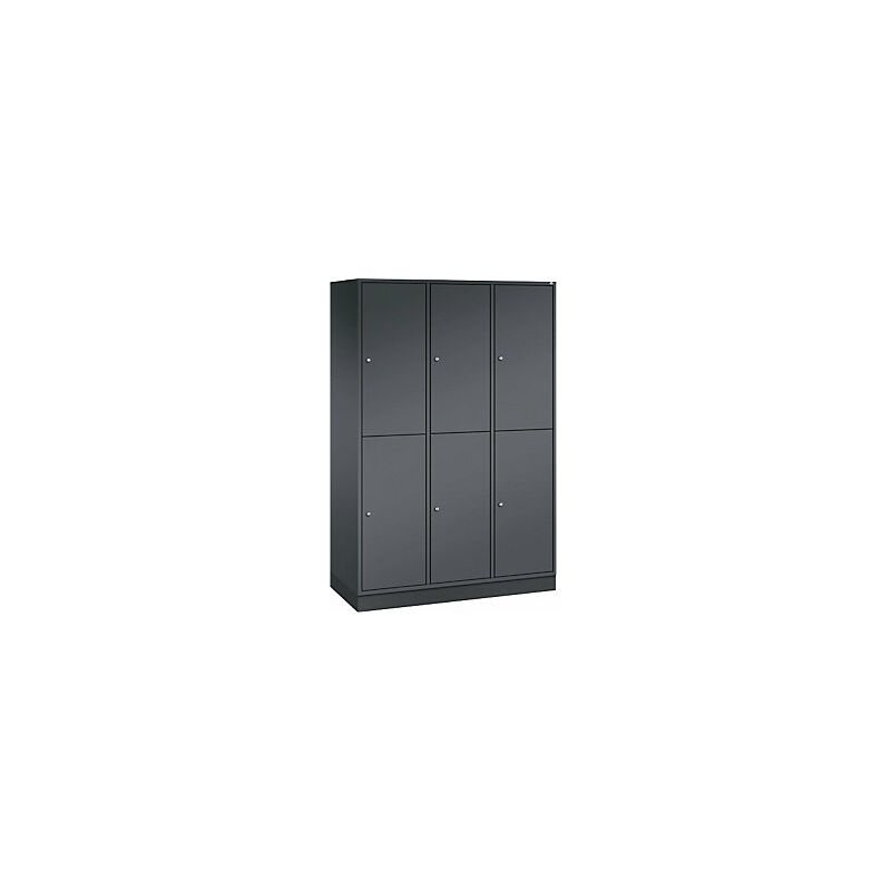 Armadietto guardaroba in acciaio INTRO sovrapposto a due posti, largh. x prof. 1220 x 500 mm, 6 scomparti, corpo grigio nerastro, ante grigio nerastro. Fornitura = montato. Altezza = 1950 mm. Profondità = 500 mm. Larghezza = 1220 mm. Colore corpo = grigio nerastro RAL 7021. Colore porta = grigio nerastro RAL 7021. Serratura = serratura a cilindro differenziata. Numero scomparti in larghezza = 3 pz. Numero scomparti = 6 pz. Larghezza scomparti = 400 mm. Materiale = lamiera d'acciaio. Altezza armadietto = 1950 mm. Dotazione interna = 1 asta appendiabiti, 3 ganci scorrevoli. Larghezza interna = 360 mm. Altezza interna = 895 mm. Profondità interna = 460 mm. Tipo di porta = anta a battente. Numero chiavi = 2 pz. Altezza scomparti = 895 mm. Larghezza ripiani = 360 mm. Profondità ripiani = 500 mm. Altezza zoccolo = 100 mm. Struttura = con saldatura. Superficie = con verniciatura a forno. Struttura in acciaio di lunga durata. Serratura a cilindro con 2 chiavi. Fori di aerazione sulla parete