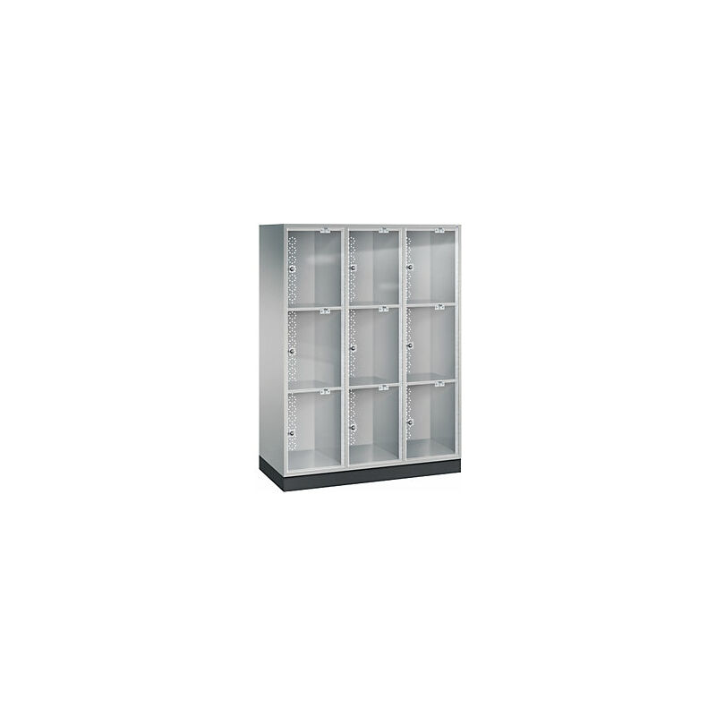 Armadietto a scomparti in acciaio INTRO con anta in vetro acrilico, alt. x largh. x prof. 1750 x 1220 x 500 mm, altezza scomparto 510 mm, 9 scomparti, corpo alluminio brillante. Fornitura = montato. Altezza = 1750 mm. Profondità = 500 mm. Larghezza = 1220 mm. Colore corpo = alluminio brillante RAL 9006. Colore porta = trasparente. Serratura = serratura a cilindro differenziata. Numero scomparti in larghezza = 3 pz. Numero scomparti = 9 pz. Larghezza scomparti = 400 mm. Materiale = lamiera d'acciaio. Altezza armadietto = 1750 mm. Dotazione interna = senza dotazione interna. Larghezza interna = 360 mm. Altezza interna = 510 mm. Profondità interna = 460 mm. Tipo di porta = anta a battente. Numero chiavi = 2 pz. Altezza scomparti = 510 mm. Larghezza ripiani = 400 mm. Profondità ripiani = 500 mm. Altezza zoccolo = 100 mm. Struttura = con saldatura. Superficie = verniciatura. Struttura in acciaio di lunga durata. Serratura a cilindro con 2 chiavi. Fori di aerazione sulla parete posteriore e