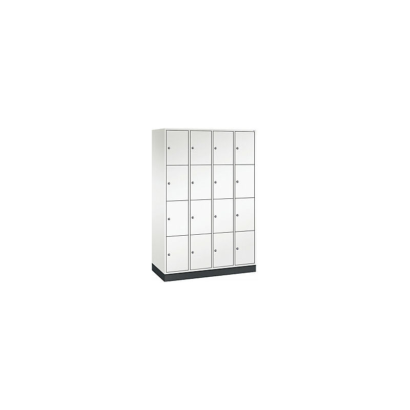 Armadietto a scomparti in acciaio INTRO, altezza scomparto 435 mm, largh. x prof. 1220 x 500 mm, 16 scomparti, corpo bianco puro, ante bianco puro. Fornitura = montato. Altezza = 1950 mm. Profondità = 500 mm. Larghezza = 1220 mm. Colore corpo = bianco puro RAL 9010. Colore porta = bianco puro RAL 9010. Serratura = serratura a cilindro differenziata. Numero scomparti in larghezza = 4 pz. Numero scomparti = 16 pz. Larghezza scomparti = 300 mm. Materiale = lamiera d'acciaio. Altezza armadietto = 1950 mm. Dotazione interna = senza dotazione interna. Larghezza interna = 260 mm. Altezza interna = 435 mm. Profondità interna = 460 mm. Tipo di porta = anta a battente. Numero chiavi = 2 pz. Altezza scomparti = 435 mm. Larghezza ripiani = 300 mm. Profondità ripiani = 500 mm. Altezza zoccolo = 100 mm. Struttura = con saldatura. Superficie = verniciatura. Ante a parete doppia per maggiore stabilità. Struttura in acciaio di lunga durata. Serratura a cilindro con 2 chiavi. Fori di aerazione sulla