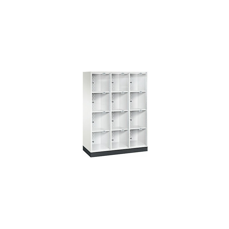 Armadietto a scomparti in acciaio INTRO con anta in vetro acrilico, alt. x largh. x prof. 1750 x 1220 x 500 mm, altezza scomparto 380 mm, 12 scomparti, corpo bianco puro. Fornitura = montato. Altezza = 1750 mm. Profondità = 500 mm. Larghezza = 1220 mm. Colore corpo = bianco puro RAL 9010. Colore porta = trasparente. Serratura = serratura a cilindro differenziata. Numero scomparti in larghezza = 3 pz. Numero scomparti = 12 pz. Larghezza scomparti = 400 mm. Materiale = lamiera d'acciaio. Altezza armadietto = 1750 mm. Dotazione interna = senza dotazione interna. Larghezza interna = 360 mm. Altezza interna = 380 mm. Profondità interna = 460 mm. Tipo di porta = anta a battente. Numero chiavi = 2 pz. Altezza scomparti = 380 mm. Larghezza ripiani = 400 mm. Profondità ripiani = 500 mm. Altezza zoccolo = 100 mm. Struttura = con saldatura. Superficie = verniciatura. Struttura in acciaio di lunga durata. Serratura a cilindro con 2 chiavi. Fori di aerazione sulla parete posteriore e distanziali da
