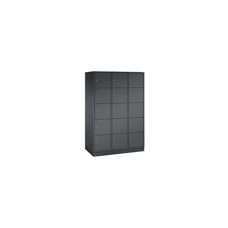 Armadietto a scomparti in acciaio INTRO, altezza scomparto 345 mm, largh. x prof. 1220 x 600 mm, 15 scomparti, corpo grigio nerastro, ante grigio nerastro. Fornitura = montato. Altezza = 1950 mm. Profondità = 600 mm. Larghezza = 1220 mm. Colore corpo = grigio nerastro RAL 7021. Colore porta = grigio nerastro RAL 7021. Serratura = serratura a cilindro differenziata. Numero scomparti in larghezza = 3 pz. Numero scomparti = 15 pz. Larghezza scomparti = 400 mm. Materiale = lamiera d'acciaio. Altezza armadietto = 1950 mm. Dotazione interna = senza dotazione interna. Larghezza interna = 360 mm. Altezza interna = 345 mm. Profondità interna = 560 mm. Tipo di porta = anta a battente. Numero chiavi = 2 pz. Altezza scomparti = 345 mm. Larghezza ripiani = 400 mm. Profondità ripiani = 600 mm. Altezza zoccolo = 100 mm. Struttura = con saldatura. Superficie = con verniciatura a forno. Struttura in acciaio di lunga durata. Serratura a cilindro con 2 chiavi. Fori di aerazione sulla parete posteriore e