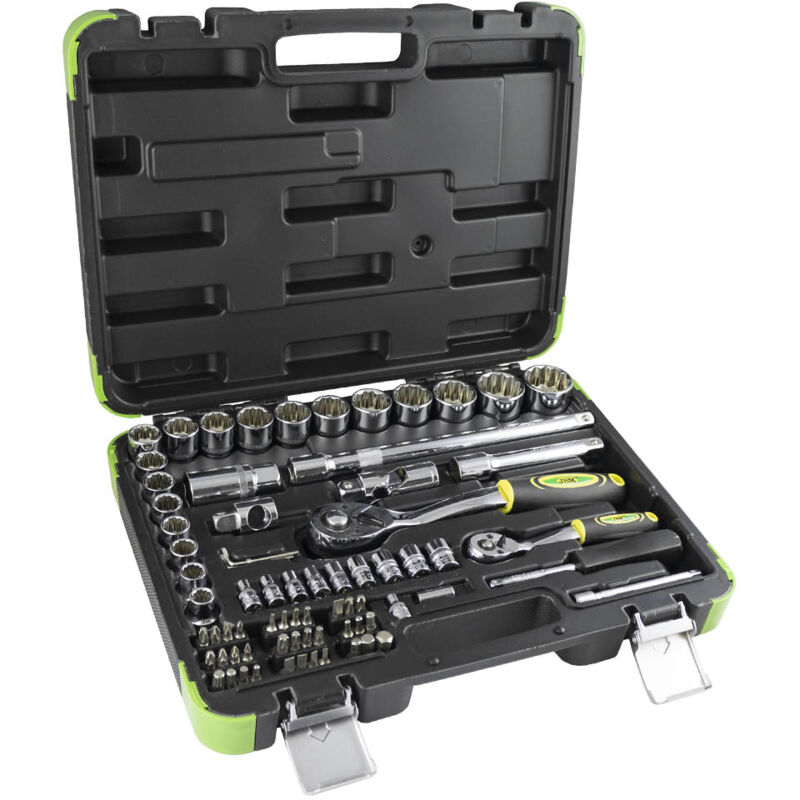 Valigetta portautensili Utensili da 1/2": 18 bussole metriche a 12 taglienti: 10, 11, 12, 13, 14, 15, 16, 17, 18, 19, 20, 21, 22, 23, 24, 27, 30 e 32 mm 01 cricchetto universale 1/2" 02 barre di prolunga 5" e 10" 01 snodo universale 1/2" 01 bussola candela 21 mm 01 adattatore 3/8" femmina e 1/2" maschio 03 chiavi a brugola: 1,5, 2 e 2,5 mm 01 Scatola di plastica Utensili da 1/4": 09 Bussole metriche a 12 taglienti: 4, 5, 5,5, 6, 7, 8, 10, 11, 12 e 13 mm 01 Cricchetto universale da 1/4" 01 Barra di prolunga da 4" 01 Manico del cacciavite 01 Adattatore per testa 33 Teste: 05 Stella: #0, #1, #2, #3, #4 05 Doppia stella: #0, #1, #2, #3, #4 08 Torx a 6 taglienti: T8, T10, T15, T20, T25, T27, T30 e T40 04 Punte a 12 taglienti: 4, 5, 6 e 7 06 Brugola: 3, 4, 5, 6, 8 e 10 mm 05 Piani di: 3, 4, 5.5, 6 e 7