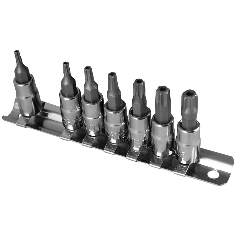 Set di punte torx collegabili contenente: punte t-10, t-15, t-20, t-25, t-30, t-40, t-45. presentato in una guida in metallo