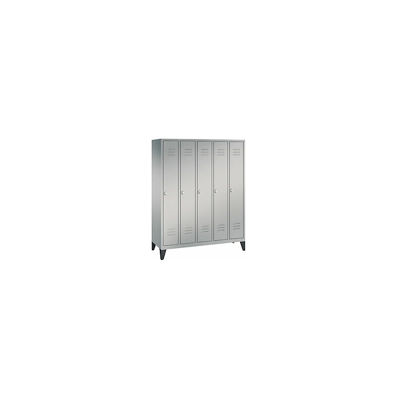 Armadietto guardaroba CLASSIC, con piedini, 5 vani, larghezza vani 300 mm, alluminio brillante. Fornitura = montato. Altezza = 1850 mm. Profondità = 500 mm. Larghezza = 1500 mm. Colore corpo = alluminio brillante RAL 9006. Colore porta = alluminio brillante RAL 9006. Serratura = chiavistello girevole predisposto per lucchetto. Numero scomparti in larghezza = 5 pz. Larghezza scomparti = 300 mm. Materiale = lamiera d'acciaio. Dotazione interna = 1 ripiano, 1 asta appendiabiti con 3 ganci scorrevoli. Larghezza interna = 230 mm. Altezza interna = 1600 mm. Profondità interna = 465 mm. Tipo di porta = anta a battente. Altezza piedini = 150 mm. Struttura = con saldatura. Superficie = verniciatura. Struttura in acciaio di lunga durata. Angolo di apertura anta 110°. Alta resistenza ai raggi UV e alla corrosione. Piedini dell'armadio in plastica, quindi elevata protezione dell'armadio dalla corrosione. Corpo in robusta struttura d'acciaio con verniciatura a forno di alta qualità per un'elevata