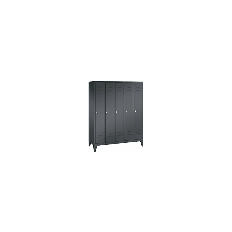 Armadietto guardaroba CLASSIC, con piedini, 5 vani, larghezza vani 300 mm, grigio nerastro. Fornitura = montato. Altezza = 1850 mm. Profondità = 500 mm. Larghezza = 1500 mm. Colore corpo = grigio nerastro RAL 7021. Colore porta = grigio nerastro RAL 7021. Serratura = chiavistello girevole predisposto per lucchetto. Numero scomparti in larghezza = 5 pz. Larghezza scomparti = 300 mm. Materiale = lamiera d'acciaio. Dotazione interna = 1 ripiano, 1 asta appendiabiti con 3 ganci scorrevoli. Larghezza interna = 230 mm. Altezza interna = 1600 mm. Profondità interna = 465 mm. Tipo di porta = anta a battente. Altezza piedini = 150 mm. Struttura = con saldatura. Superficie = verniciatura. Struttura in acciaio di lunga durata. Angolo di apertura anta 110°. Alta resistenza ai raggi UV e alla corrosione. Piedini dell'armadio in plastica, quindi elevata protezione dell'armadio dalla corrosione. Corpo in robusta struttura d'acciaio con verniciatura a forno di alta qualità per un'elevata resistenza ai