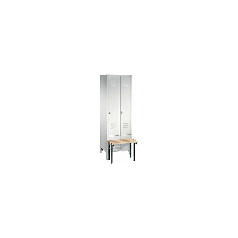 Armadietto guardaroba CLASSIC, con panca anteriore, 2 vani, larghezza vani 300 mm, grigio chiaro. Fornitura = montato. Altezza = 1850 mm. Larghezza = 610 mm. Profondità = 815 mm. Colore corpo = grigio chiaro RAL 7035. Colore porta = grigio chiaro RAL 7035. Serratura = chiavistello girevole predisposto per lucchetto. Numero scomparti in larghezza = 2 pz. Materiale = lamiera d'acciaio, laccata. Larghezza scomparti = 300 mm. Profondità scomparti = 500 mm. Dotazione interna = 1 ripiano, 1 asta appendiabiti con 3 ganci scorrevoli. Altezza sedile = 420 mm. Profondità sedile = 315 mm. Altezza piedini = 150 mm. Altezza armadio = 1850 mm. Profondità armadio = 500 mm. Tipo di porta = anta a battente. Colore doghe = faggio. Colore telaio = grigio nerastro RAL 7021. Serie = CLASSIC. Larghezza interna = 230 mm. Altezza interna = 1315 mm. Struttura in acciaio di lunga durata. Angolo di apertura anta 110°. Alta resistenza ai raggi UV e alla corrosione. Panche con piedini regolabili per la semplice
