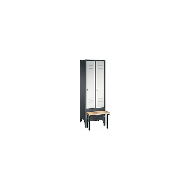 Armadietto guardaroba CLASSIC, con panca anteriore, 2 vani, larghezza vani 300 mm, grigio nerastro / grigio chiaro. Fornitura = montato. Altezza = 1850 mm. Larghezza = 610 mm. Profondità = 815 mm. Colore corpo = grigio nerastro RAL 7021. Colore porta = grigio chiaro RAL 7035. Serratura = chiavistello girevole predisposto per lucchetto. Numero scomparti in larghezza = 2 pz. Materiale = lamiera d'acciaio, laccata. Larghezza scomparti = 300 mm. Profondità scomparti = 500 mm. Dotazione interna = 1 ripiano, 1 asta appendiabiti con 3 ganci scorrevoli. Altezza sedile = 420 mm. Profondità sedile = 315 mm. Altezza piedini = 150 mm. Altezza armadio = 1850 mm. Profondità armadio = 500 mm. Tipo di porta = anta a battente. Colore doghe = faggio. Colore telaio = grigio nerastro RAL 7021. Serie = CLASSIC. Larghezza interna = 230 mm. Altezza interna = 1315 mm. Struttura in acciaio di lunga durata. Angolo di apertura anta 110°. Alta resistenza ai raggi UV e alla corrosione. Panche con piedini