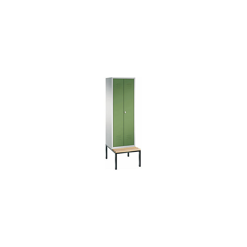 Armadietto guardaroba CLASSIC, ante battenti, con panca integrata, 2 vani, larghezza vani 300 mm, grigio chiaro / verde reseda. Fornitura = montato. Altezza = 2090 mm. Larghezza = 610 mm. Profondità = 815 mm. Colore corpo = grigio chiaro RAL 7035. Colore porta = verde reseda RAL 6011. Serratura = chiavistello girevole predisposto per lucchetto. Numero scomparti in larghezza = 2 pz. Materiale = lamiera d'acciaio, laccata. Larghezza scomparti = 300 mm. Profondità scomparti = 500 mm. Dotazione interna = 1 ripiano, 1 asta appendiabiti con 3 ganci scorrevoli. Altezza sedile = 420 mm. Profondità sedile = 315 mm. Altezza armadio = 2090 mm. Profondità armadio = 500 mm. Tipo di porta = anta a battente. Colore doghe = faggio. Colore telaio = grigio nerastro RAL 7021. Versione = con panca integrata. Serie = CLASSIC. Larghezza interna = 230 mm. Altezza interna = 1600 mm. Struttura in acciaio di lunga durata. Angolo di apertura anta 110°. Alta resistenza ai raggi UV e alla corrosione. Panche con