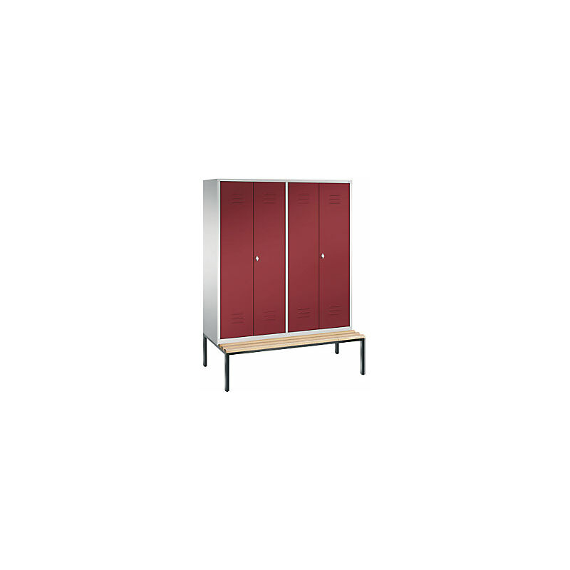 Armadietto guardaroba CLASSIC, ante battenti, con panca integrata, 4 vani, larghezza vani 400 mm, grigio chiaro / rosso rubino. Fornitura = montato. Altezza = 2090 mm. Larghezza = 1590 mm. Profondità = 815 mm. Colore corpo = grigio chiaro RAL 7035. Colore porta = rosso rubino RAL 3003. Serratura = chiavistello girevole predisposto per lucchetto. Numero scomparti in larghezza = 4 pz. Materiale = lamiera d'acciaio, laccata. Larghezza scomparti = 400 mm. Profondità scomparti = 500 mm. Dotazione interna = 1 ripiano, 1 asta appendiabiti con 3 ganci scorrevoli. Altezza sedile = 420 mm. Profondità sedile = 315 mm. Altezza armadio = 2090 mm. Profondità armadio = 500 mm. Tipo di porta = anta a battente. Colore doghe = faggio. Colore telaio = grigio nerastro RAL 7021. Versione = con panca integrata. Serie = CLASSIC. Larghezza interna = 330 mm. Altezza interna = 1600 mm. Struttura in acciaio di lunga durata. Angolo di apertura anta 110°. Alta resistenza ai raggi UV e alla corrosione. Panche con