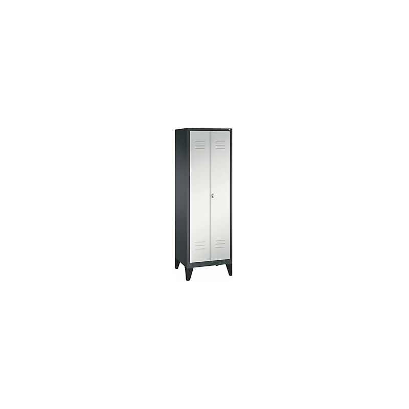 Armadio di magazzinaggio CLASSIC, ante battenti, con piedini, 1 vano, larghezza vano 600 mm, grigio nerastro / grigio chiaro. Fornitura = montato. Altezza = 1850 mm. Profondità = 500 mm. Larghezza = 610 mm. Colore corpo = grigio nerastro RAL 7021. Colore porta = grigio chiaro RAL 7035. Serratura = chiavistello girevole predisposto per lucchetto. Numero scomparti in larghezza = 1 pz. Larghezza scomparti = 600 mm. Materiale = lamiera d'acciaio. Altezza armadietto = 1850 mm. Dotazione interna = 4 ripiani inseribili. Larghezza interna = 530 mm. Profondità interna = 465 mm. Tipo di porta = anta a battente. Larghezza ripiani = 600 mm. Profondità ripiani = 500 mm. Altezza piedini = 150 mm. Struttura = con saldatura. Superficie = verniciatura. Struttura in acciaio di lunga durata. Angolo di apertura anta 110°. Corpo in robusta costruzione d'acciaio con verniciatura a forno di alta qualità, ante a battente con serratura unica, 4 piani d'appoggio interni. Fondo dell'armadio con aperture di