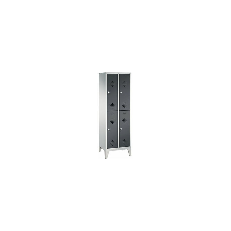 Armadietto guardaroba CLASSIC, a due piani, con piedini, 2 vani, 2 scomparti per vano, larghezza vani 300 mm, grigio chiaro / grigio nerastro. Fornitura = montato. Altezza = 1850 mm. Profondità = 500 mm. Larghezza = 610 mm. Colore corpo = grigio chiaro RAL 7035. Colore porta = grigio nerastro RAL 7021. Serratura = chiavistello girevole predisposto per lucchetto. Numero scomparti = 4 pz. Larghezza scomparti = 300 mm. Materiale = lamiera d'acciaio. Dotazione interna = per scomparto: 1 asta appendiabiti con 3 ganci scorrevoli. Larghezza interna = 230 mm. Altezza interna = 786 mm. Profondità interna = 465 mm. Tipo di porta = anta a battente. Altezza scomparti = 820 mm. Larghezza ripiani = 300 mm. Profondità ripiani = 500 mm. Altezza piedini = 150 mm. Struttura = con saldatura. Superficie = verniciatura. Struttura in acciaio di lunga durata. Angolo di apertura anta 110°. Armadietto guardaroba in acciaio a due piani. Corpo in robusta costruzione d'acciaio con verniciatura a forno di alta