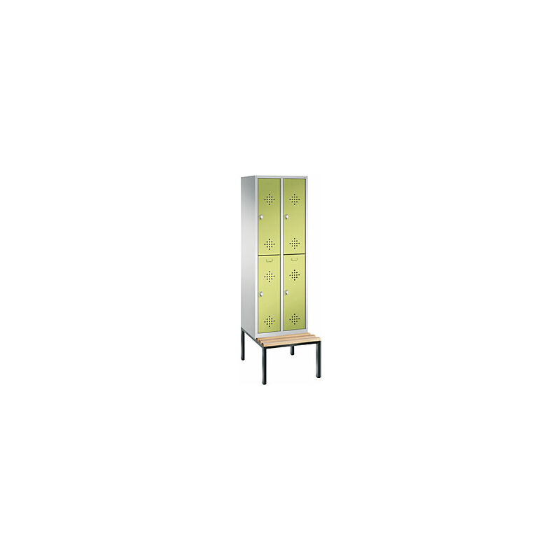 Armadietto guardaroba CLASSIC, a due piani, con panca integrata, 2 vani, 2 scomparti per vano, larghezza vani 300 mm, grigio chiaro / verdino. Fornitura = montato. Altezza = 2090 mm. Larghezza = 610 mm. Profondità = 815 mm. Colore corpo = grigio chiaro RAL 7035. Colore porta = verde azzurrognolo RDS 1108060. Serratura = chiavistello girevole predisposto per lucchetto. Numero scomparti in larghezza = 2 pz. Numero scomparti = 4 pz. Materiale = lamiera d'acciaio, laccata. Larghezza scomparti = 300 mm. Profondità scomparti = 500 mm. Dotazione interna = per scomparto: 1 asta appendiabiti con 3 ganci scorrevoli. Altezza sedile = 420 mm. Profondità sedile = 315 mm. Profondità armadio = 500 mm. Tipo di porta = anta a battente. Colore doghe = faggio. Colore telaio = grigio nerastro RAL 7021. Versione = con panca integrata. Serie = CLASSIC. Larghezza interna = 230 mm. Altezza interna = 786 mm. Struttura in acciaio di lunga durata. Angolo di apertura anta 110°. Armadietto guardaroba in acciaio a