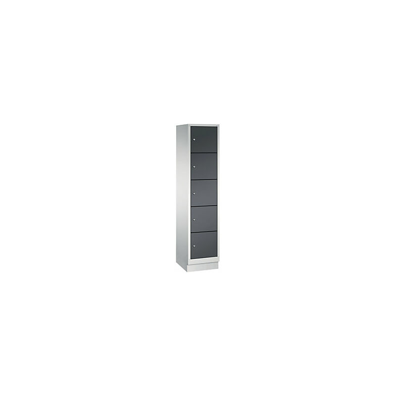 Armadio a scomparti CLASSIC, con zoccolino, 1 vano, 5 scomparti, larghezza vano 400 mm, grigio chiaro / grigio nerastro. Fornitura = montato. Altezza = 1800 mm. Profondità = 500 mm. Larghezza = 420 mm. Colore corpo = grigio chiaro RAL 7035. Colore porta = grigio nerastro RAL 7021. Serratura = serratura a cilindro differenziata. Numero scomparti = 5 pz. Larghezza scomparti = 400 mm. Materiale = lamiera d'acciaio. Dotazione interna = senza dotazione interna. Larghezza interna = 330 mm. Altezza interna = 295 mm. Profondità interna = 465 mm. Tipo di porta = anta a battente. Numero chiavi = 2 pz. Altezza scomparti = 320 mm. Larghezza ripiani = 400 mm. Profondità ripiani = 500 mm. Altezza zoccolo = 100 mm. Struttura = con saldatura. Superficie = verniciatura. Struttura in acciaio di lunga durata. 1 serratura a cilindro per scomparto, ognuna con 2 chiavi. Angolo di apertura anta 110°. Verniciatura a forno di qualità per elevata resistenza ai raggi UV e alla corrosione. Zoccolino arretrato per