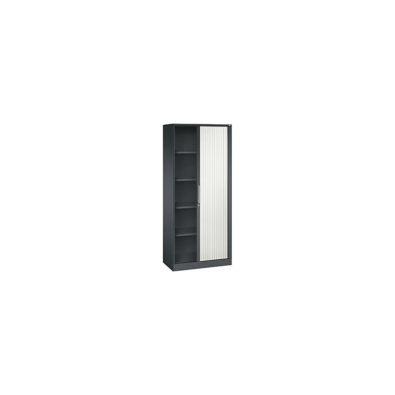 Armadio con serranda ASISTO, altezza 1980 mm, larghezza 800 mm, grigio nerastro/bianco traffico. Fornitura = montato. Altezza = 1980 mm. Larghezza = 800 mm. Profondità = 435 mm. Colore corpo = grigio nerastro RAL 7021. Materiale corpo = lamiera d'acciaio, verniciata a polvere. Colore serranda = bianco traffico RAL 9016. Caratteristiche = con serratura. Serratura = serratura a cilindro. Numero file raccoglitori = 5 pz. Materiale serranda = plastica. Dotazione interna = 4 ripiani. Numero ripiani = 4 pz. Portata per ripiano = 50 kg. Colore ripiani = grigio nerastro RAL 7021. Tipo di porta = serrande. Passo di regolazione altezza ripiani = 15 mm. Larghezza interna = 695 mm. Altezza interna = 1865 mm. Profondità interna = 365 mm. Spessore ripiani = 24 mm. Spessore del corpo = 0.88 mm. Altezza zoccolo = 90 mm. Serrande scorrevoli e silenziose su guide leggere. Alta flessibilità grazie alla dotazione interna regolabile in altezza con passo di 15 mm. Serratura con blocco a gancio con nucleo