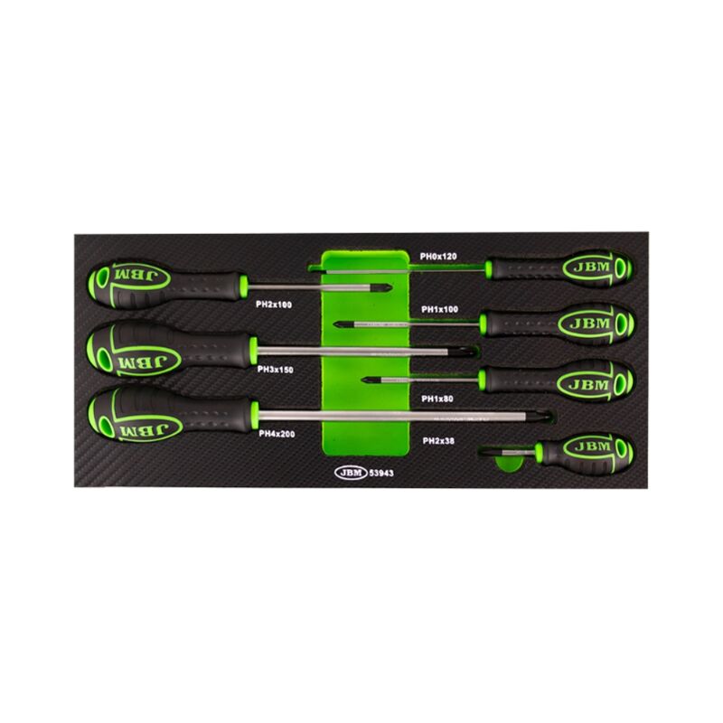 Set di 7 cacciaviti a croce. Comprende le misure: PH0x120 PH1x80 PH1x100 PH2x38 PH2x100 PH3x150 PH4x200
