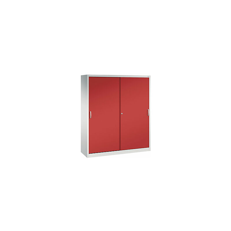 Armadio con ante scorrevoli ACURADO, 6 ripiani, 2 scomparti con serratura, alt. x largh. x prof. 1950 x 1600 x 500 mm, grigio chiaro / rosso fuoco. Fornitura = montato. Larghezza = 1600 mm. Altezza = 1950 mm. Profondità = 500 mm. Colore corpo = grigio chiaro RAL 7035. Materiale = acciaio. Tipo di prodotto = armadi con ante scorrevoli. Tipo di porta = porta scorrevole. Colore porta = rosso fuoco RAL 3000. Numero ante = 2 pz. Numero ripiani = 2x3 pz. Materiale ripiani = acciaio, con verniciatura a forno. Colore ripiani = grigio chiaro RAL 7035. Portata per ripiano = 70 kg. Caratteristiche = con serratura. Serratura = serratura a cilindro girevole a pressione, serratura a cilindro a leva. Numero file raccoglitori = 5 pz. Dotazione interna = 6 ripiani, 2 scomparti con serratura, parete divisoria centrale. Passo di regolazione altezza ripiani = 15 mm. Altezza zoccolo = 100 mm. Spessore ripiani = 24 mm. Spessore del corpo = 0.88 mm. Spessore porta = 19 mm. Ante scorrevoli in acciaio su