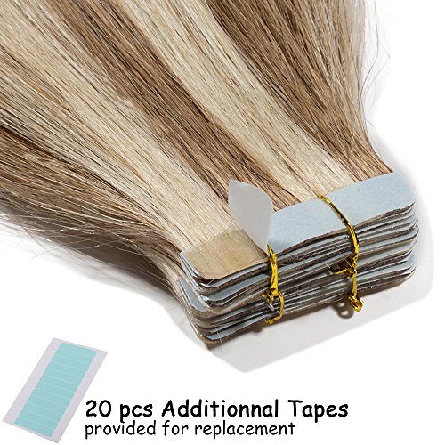 55cm Extension Capelli Veri Biadesivo con Meche 40 fasce 100g Remy Human Hair Tape in Riutilizzabile Seamless, 12/613 Marrone Chiaro/Biondo Chiarissimo