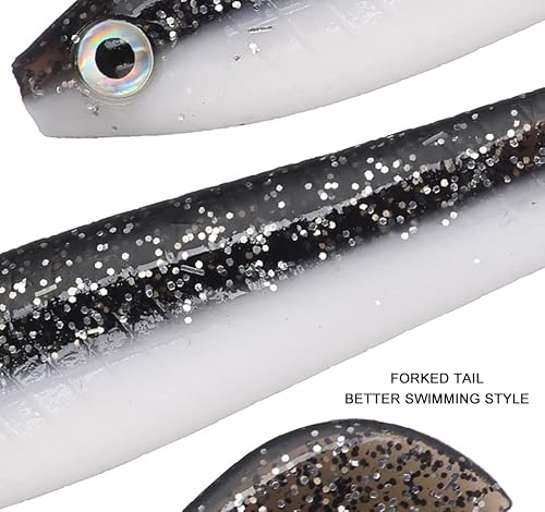 【High Simulation】: This shad soft plastic lure with 3D realistic looking eyes and pearl powder coating. soft body, a forked tail,real fishy smell, glitter scales provide reflection under the water. A perfect fishing bait that easily cheats the target fishes.