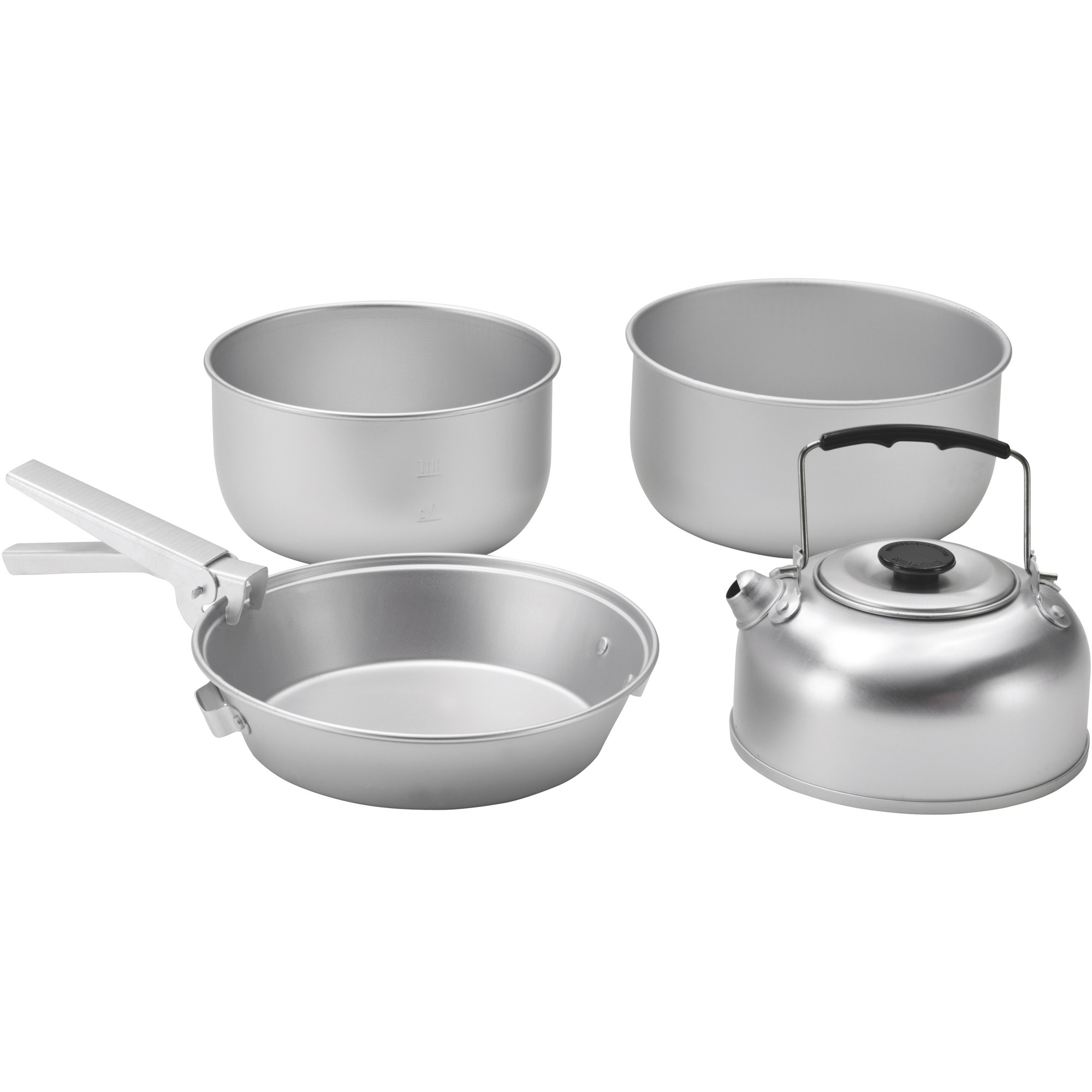 Con il set da cucina in alluminio L di Easy Camp, un pasto veloce e completo è facilmente preparato. Il set contiene due pentole, una padella, un bollitore e una pinza come manico per pentole e padelle.