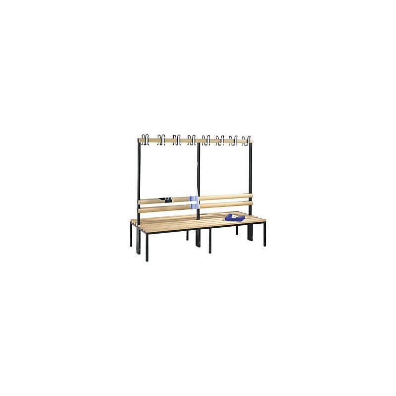 Panca per spogliatoi BASIC, due lati utili, listello portaganci, faggio, lunghezza 1960 mm. Fornitura = preassemblato, montaggio finale a cura del cliente. Lunghezza = 1960 mm. Altezza sedile = 420 mm. Profondità sedile = 353 mm. Colore telaio = grigio nerastro RAL 7021. Materiale telaio = tubo d'acciaio a sezione quadra. Profondità totale = 750 mm. Sedile = due lati utili. Materiale doghe = legno di faggio. Colore doghe = faggio naturale. Altezza totale = 1650 mm. Versione panchina = con schienale e asta appendiabiti. Numero doghe = 4 pz. Versione telaio = struttura in tubi d'acciaio. Numero ganci = 16 pz. Campo di regolazione altezza = 10 mm. Tipo di prodotto = panche per spogliatoi. Panca con due lati utili, telaio con 4 piedini in robusto tubo a sezione quadrata 30 x 30 mm, piedini regolabili per la semplice messa in piano. Con schienale e listello appendiabiti con ganci doppi in plastica non a vista ai sensi di DIN 7917 e targhetta sostituibile. Doghe profilate in legno duro di