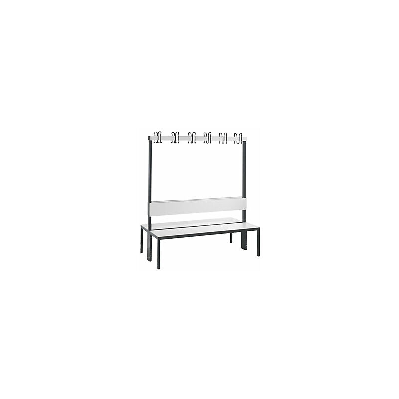 Panca per spogliatoi BASIC PLUS, due lati utili, seduta in HPL, listello portaganci, lunghezza 1500 mm, bianco. Fornitura = preassemblato, montaggio finale a cura del cliente. Lunghezza = 1500 mm. Altezza sedile = 420 mm. Profondità sedile = 353 mm. Colore telaio = grigio nerastro RAL 7021. Materiale telaio = tubo d'acciaio a sezione quadra. Profondità totale = 760 mm. Sedile = due lati utili. Materiale doghe = HPL (laminato ad alta pressione). Colore doghe = bianco. Altezza totale = 1650 mm. Versione panchina = con schienale e asta appendiabiti. Numero doghe = 1 pz. Versione telaio = struttura in tubi d'acciaio. Numero ganci = 12 pz. Campo di regolazione altezza = 10 mm. Caratteristiche = ideale in ambienti umidi. Tipo di prodotto = panche per spogliatoi. Piedini regolabili (fino a 10 mm). Ideali in ambienti umidi. Ideale per spogliatoi. Panca con schienale. Telaio con 4 piedini in robusto tubo a sezione quadrata 30 x 30 mm, zincatura elettrolitica e verniciatura a forno di alta