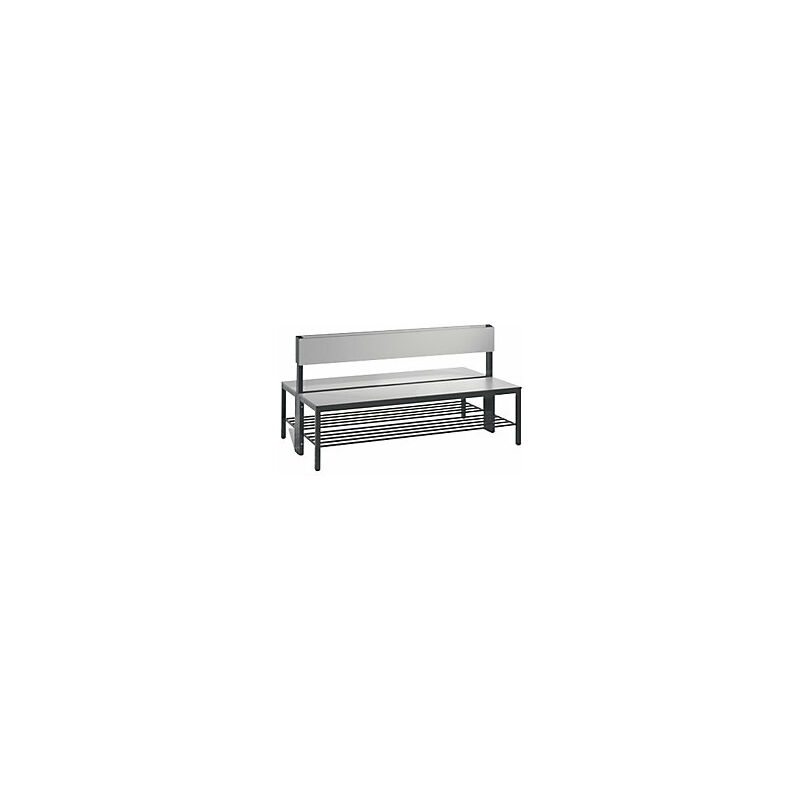 Panca per spogliatoi BASIC PLUS, due lati utili, seduta in HPL, metà altezza, ripiano per scarpe, lunghezza 1500 mm, grigio argento. Fornitura = preassemblato, montaggio finale a cura del cliente. Lunghezza = 1500 mm. Altezza sedile = 420 mm. Profondità sedile = 353 mm. Colore telaio = grigio nerastro RAL 7021. Materiale telaio = tubo d'acciaio a sezione quadra. Profondità totale = 760 mm. Sedile = due lati utili. Materiale doghe = HPL (laminato ad alta pressione). Colore doghe = grigio argento. Altezza totale = 796 mm. Versione panchina = con ripiano scarpe, con schienale. Numero doghe = 1 pz. Versione telaio = struttura in tubi d'acciaio. Campo di regolazione altezza = 10 mm. Caratteristiche = ideale in ambienti umidi. Tipo di prodotto = panche per spogliatoi. Piedini regolabili (fino a 10 mm). Ideali in ambienti umidi. Ideale per spogliatoi. Panca con schienale. Telaio con 4 piedini in robusto tubo a sezione quadrata 30 x 30 mm, zincatura elettrolitica e verniciatura a forno di alta