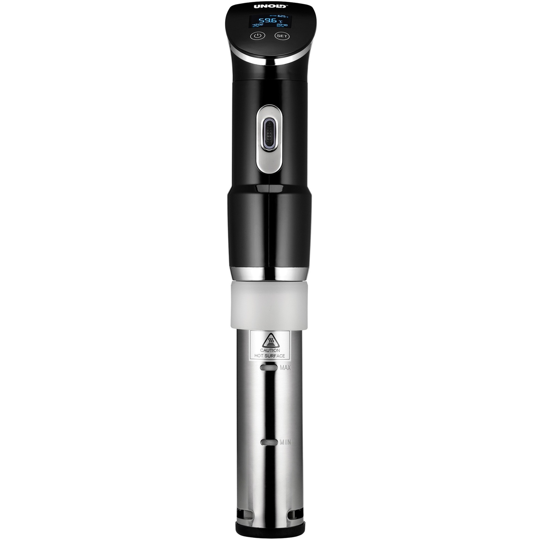 Carne, pesce o verdure, aspirati in appositi sacchetti, vengono cotti con cura e senza grassi a temperatura costante durante la cottura sous-vide, in modo da risparmiare e conservare vitamine e minerali. Carne e pesce possono quindi ottenere un breve "corso di frittura" in modo che si sviluppino aromi arrostiti leggeri e il cibo perfettamente cotto sia pronto. Il Sous-Vide Stick Time di Unold è il partner ideale per questo metodo di cottura. Riscalda fino a 20 litri di acqua in una pentola o in un''altra nave resistente al calore, l''altezza minima dovrebbe essere di 18 centimetri. Se l''acqua è alla temperatura desiderata, è possibile inserire il cibo aspirato. Con i suoi 1.300 watt, il Sous Vide Stick Time riscalda l''acqua con una precisione di +/- 0,2 gradi Celsius, la temperatura desiderata può essere impostata in passi di 0,5 gradi. Durante il processo di cottura, il grado di calore viene mantenuto costante, che è assicurato dalla potente pompa di circolazione nel Sous-Vide Stick Time. Dotato di una funzione timer (fino a 60 ore), il Sous-Vide Stick Time naturalmente privo di BPA offre anche uno spegnimento automatico se il livello dell''acqua è troppo basso. Il display LCD smussato è piacevole, quindi il tempo e la temperatura possono essere letti comodamente. Per i nuovi arrivati di Sous Vide, Unold fornisce non solo le istruzioni operative informative, ma anche ricette collaudate per iniziare questo metodo di cottura sano.