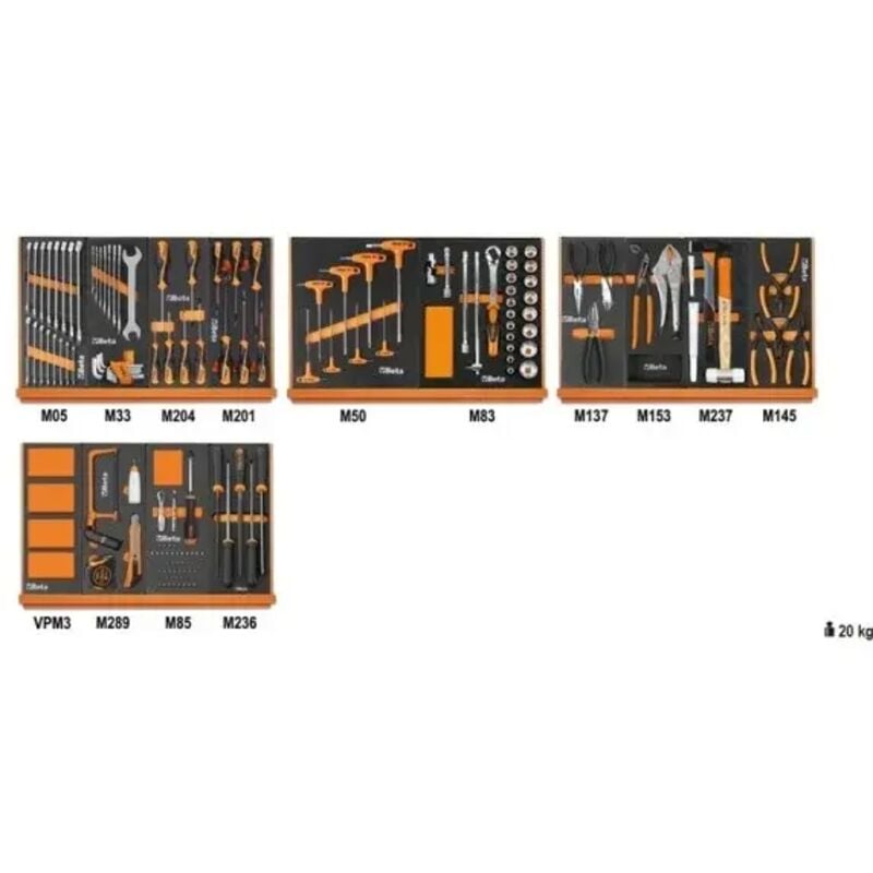 L'assortimento utensili universali in termoformati 144 Pz. è un assortimento di utensili manuali completo e versatile, include appositi termoformati. Questo assortimento è consigliato in abbinamento ai seguenti prodotti Beta: RSC23T - RSC24 - RSC24A - RSC24AXL - RSC24L/7 - RSC24L-CABRSC28 - C37 - C39 - C39SM - C39MD - C39T RSC55 - C59.La dotazione, composta da ben 144 pezzi, comprende nello specifico:- 1x Beta M05 Termoformato con 16 pezzi di Beta 42 Chiavi combinate da 6 - 7 - 8 - 9 - 10 - 11 - 12 - 13 - 14 - 15 - 16 - 17 - 18 - 19 - 20 - 21 mm- 1x Beta M33 Termoformato (17 Pz.) con:8x Beta 55 Chiavi a forchetta misure 6x7 - 8x9 - 10x11 - 12x13 - 14x15 - 16x17 - 18x19 - 20x22 mm1x Beta 96/SC9 Serie da 9 chiavi maschio esagonali piegate misure comprese tra 1,5 e 10 mm- 1x Beta M204 Termoformato con 6 pezzi di Beta 1267TX Cacciavite maschio per viti Torx misure T8 - T10 - T15 - T20 - T25 - T30- 1x Beta M201 Termoformato (6