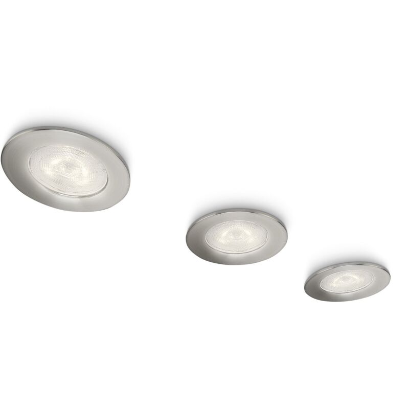 Ideale per il soggiorno e la camera da letto Illumina nel rispetto dell'ambiente Risparmio energetico Questi faretti incassati myLiving Sceptrum della Philips, sono ideali per accentuare l'illuminazione e creano un ambiente caldo ed invitante nella vostra camera da letto o nel soggiorno. Il loro design elegante si fonde amalgamandosi con il vostro soffitto, mentre le lampadine LED a risparmio energetico producono luce bianca calda abbondantemente e sono adatte per l'illuminazione interna. Ogni lampada è dotata di una lampadina LED incorporata a 3 W. Colore: Cromo opaco Materiale: Fibra sintetica Dimensioni (ciascuna luce): 9,5 x 6 cm (Diam. x A) Alimentazione: 220-240 V~, 50 Hz Potenza lampadina: 3 da 3 W Tipo di lampadina: LED (incorporato, non sostituibile) Stile d'illuminazione: Funzionale Angolo del fascio: 45 ° Flusso luminoso: 3 da 270 lm Fonte luminosa equivalente ad una lampadina tradizionale da 38 W Classe di protezione: IP20 Classe di protezione: II (doppio isolamento)