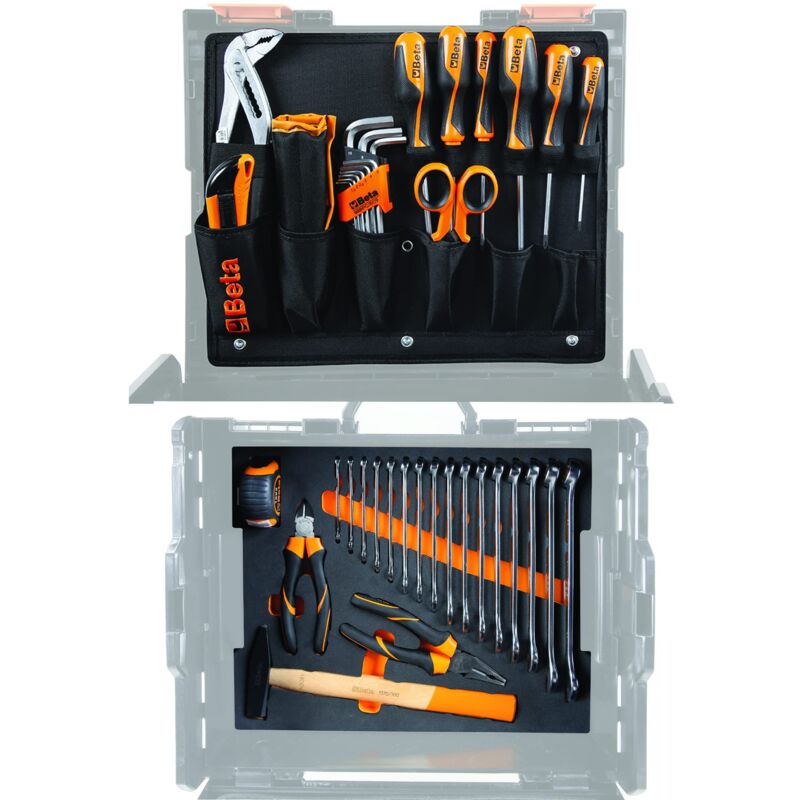 5990V1 è un assortimento di 44 utensili BETA ideali per la manutenzione generale. Fornito su vassoio in EVA compatibile risulta ideale per l'abbinamento con la valigetta portautensili C99V1 della serie COMBO. Il vassoio, realizzato in morbido in EVA, è progettato per un pratico e sicuro trasporto di una grande quantità di utensili tra I quali: chiavi, giraviti, forbici, pinze, cutter e molto altro. l'assortimento comprende: 96BPC/SC9 - Set 9 chiavi maschio esagonale piegate con estremità sferica misura: 1,5 - 2 - 2,5 - 3 - 4 - 5 - 6 - 8 - 10 mm-1771 - Cutter con lama a settori, 18 mm-1048 - Pinze regolabili cerniera chiusa, 250 mm-38/B6 - Set 6 punzoni-2 Punzoni - 1 bulino - 3 scalpelli-1260 - Set 3 giraviti lama piatta-Misura: 3,5x100 - 5,5x125 - 6,5x150 mm-1262 - Set 3 giravite con impronta a croce Phillips -Misura: PH0x60 - PH1x80 - PH2x100 mm-1128BMX - Forbici per elettricisti lame diritte-42NEW - Set 16 chiavi combinate-Misura: 6 - 7 - 8 - 9 - 10 - 11 - 12 - 13 - 14 - 15 - 16