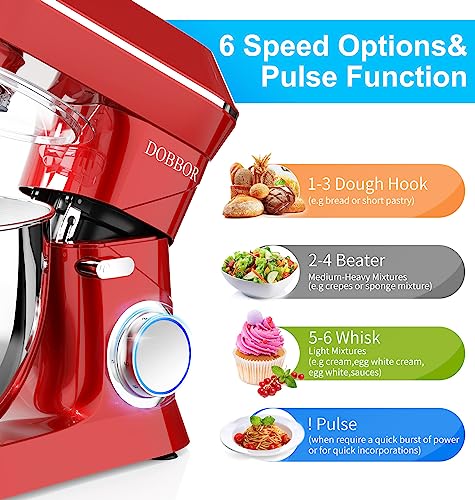 9.5Litri Impastatrice planetaria, DOBBOR 1500W Robot da Cucina con ciotola di acciaio inossidabile, 7 velocità con Gancio per Impastare, Frusta, Sbattitore, Ciotola e Coperchio (Rosso)