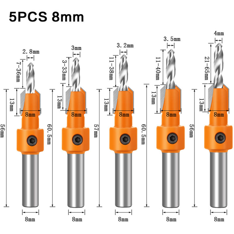Colore come mostrato Dimensioni: 11,4 x 6,2 x 5 cm Peso: 140 grammi 5 pezzi in un set: contromanicotto in acciaio appositamente progettato o foro pilota svasato 2,8 x 8 mm/3,0 x 8 mm/3,2 x 8 mm/3,5 x 8 mm/4,0 x 8 mm Premium Materiale: realizzato in acciaio legato di alta qualità, è molto adatto per la perforazione di fori nel legno di varie dimensioni. Uno strumento multiuso, migliora l'efficienza del lavoro. Compatibile con trapani con mandrino, per forare il legno o il parquet, per il fai da te, per la casa e per l'edilizia o l'ingegneria in generale, ecc. Lunghezza di foratura regolabile: può essere regolata per diverse lunghezze delle viti semplicemente allentando e serrando la vite di fissaggio.Nota: Si consiglia di utilizzare il punzone centrale per la posizione prima della perforazione, mantenere la punta verticale per evitare che la punta si pieghi o si rompa.