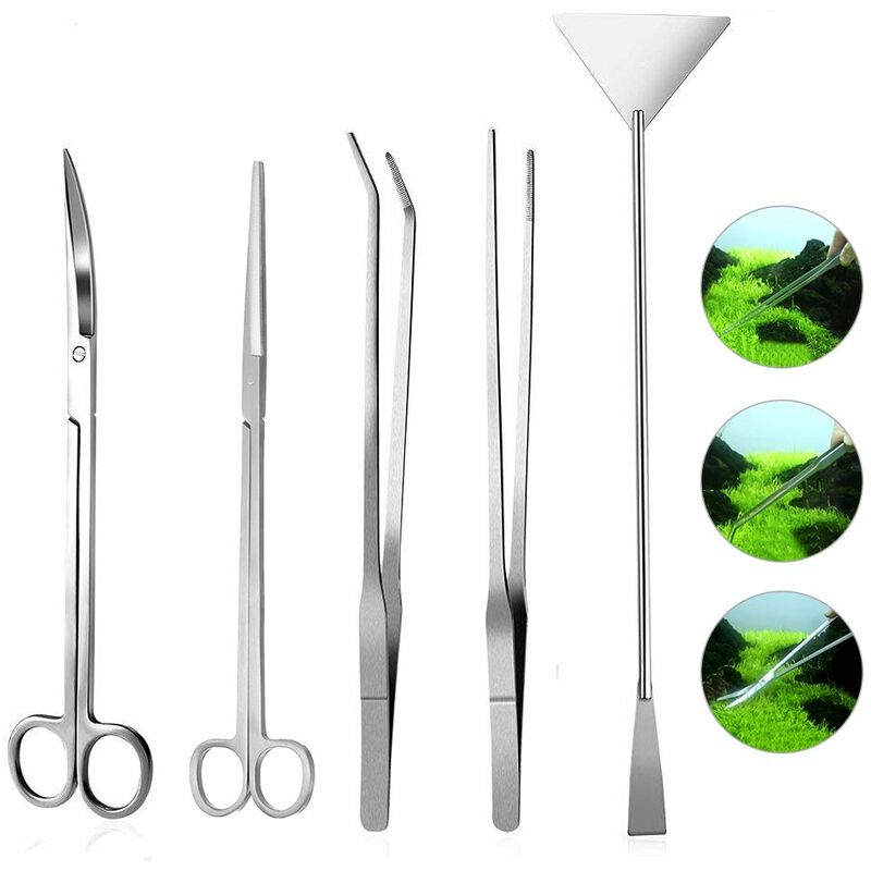 Caratteristiche: Confezione Compreso: forbici dritte, forbici curve, pinzette dritte, pinzette curve e spatola di supporto. Forbici dritte e curve: forbici affilate e lisce per potare e tagliare piante acquatiche, piante artificiali e piante vive. Pinzette dritte e curve: efficaci sul substrato sabbioso, raccolgono vermi avanzati, rimuovono le carcasse di insetti o nutrono la tua rana, serpente, camaleonti e altri animali domestici. Functional Tool Kit: molto utile durante la piantagione e altre attività quotidiane di manutenzione e pulizia dell'acquario. Manico più lungo: adatto a varie dimensioni del serbatoio di pesce. Materiali in acciaio inossidabile: robusto, antiruggine e anticorrosione. Maniglia liscia: presa confortevole. Specifiche tecniche: Materiale: acciaio inossidabile Peso dell'oggetto: 290g Peso del pacchetto: 320g Formato del pacchetto: 33 * 6 * 3 cm / 12.99 * 2.36 * 1.18in Lista del pacchetto: 1 * forbici dritte 1 * forbici curve 1 * Pinzette dritte 1 * Pinzette