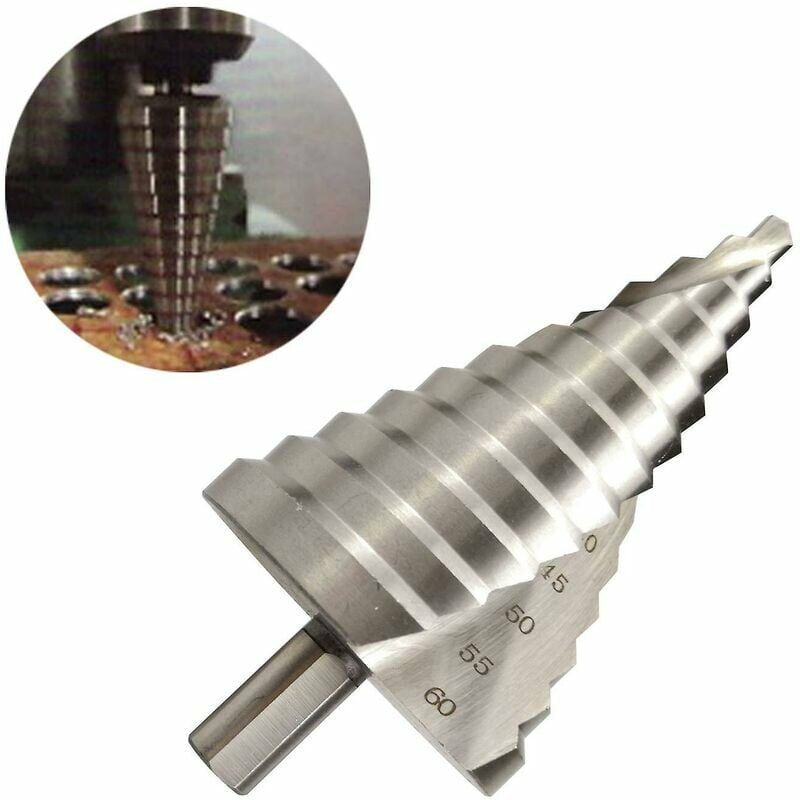 6-60mm Hss Punta per trapano a gradino Cono a spirale Svasatore a fessura 12 gradini Dimensioni delle punte a gradino: 6-60mm (12 gradini: 6,10,15,20,25,30, 35,40, 45,50,55,60 mm). Diametro stelo: 13 mm. Materiale punta a gradino: HSS 4241 Applicazione: il gradino è adatto per pezzi con durezza inferiore a 25, come acciaio al carbonio, lamiera, pannelli isolanti, pannelli in PVC, pannelli e legno. Lo spessore della parte inferiore a 5 mm. Nota: utilizzare il raffreddamento ad acqua nel trapano per prolungare la durata della punta. Velocità di foratura consigliata 250-400 giri/min. Flauto a spirale: 135 Punta a punta divisa e design a doppia scanalatura per l'autocentraggio e la sbavatura, la scanalatura a spirale aiuta a rimuovere i trucioli durante la foratura.
