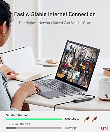 【1 Gbps Ethernet】 Hub USB C ha una velocità di rete fino a 1Gbps, retrocompatibile con 100Mbps / 10Mbps, garantendo un'esperienza online impeccabile e stabile. (Per raggiungere una rete da 1 Gbps è necessario un cavo Ethernet CAT6).