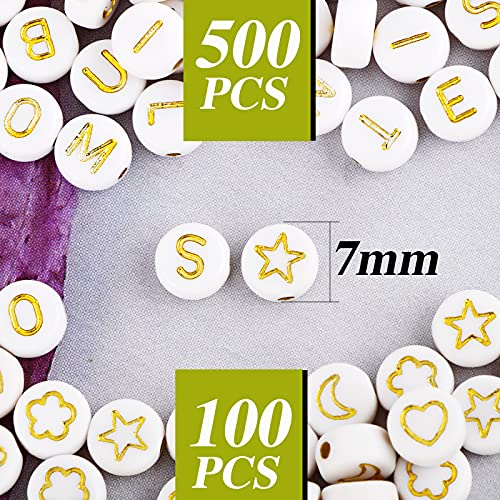 Il pacchetto include: 500 pz perline bianche con lettere dorate e 100 pz perline a forma di fiore cuore stella luna.