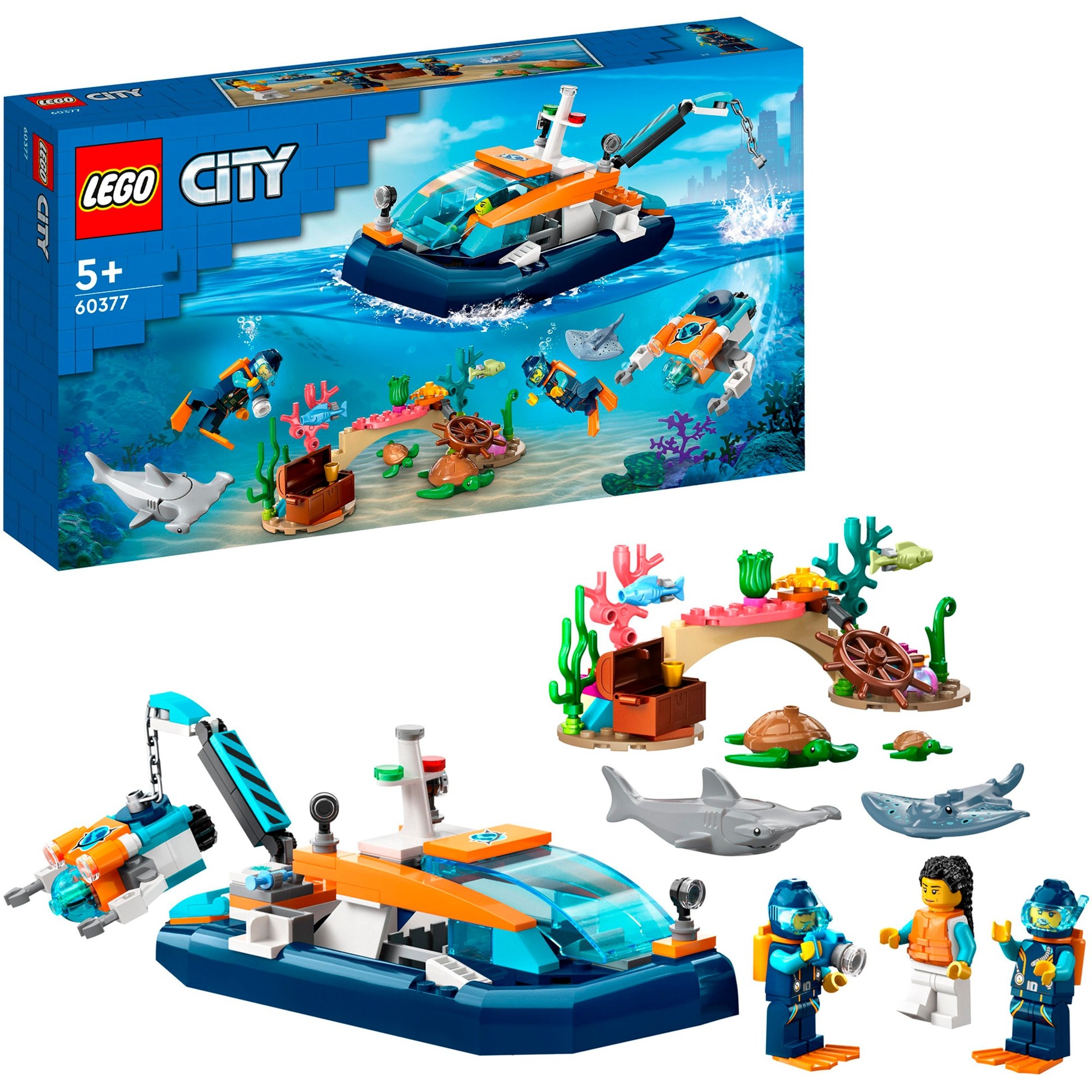 Con questa barca all''avanguardia, gli oceanografi sono alla ricerca di specie rare e grandi creature marine. Indossi l''attrezzatura subacquea e ti avventuri fino al fondo del mare. Il mini-sottomarino li accompagna. In fondo, individuano uno squalo martello e un raggio del diavolo. E alla barriera corallina, una simpatica tartaruga marina e uno scrigno del tesoro sono in attesa. Il set include 3 minifigure di esploratori.