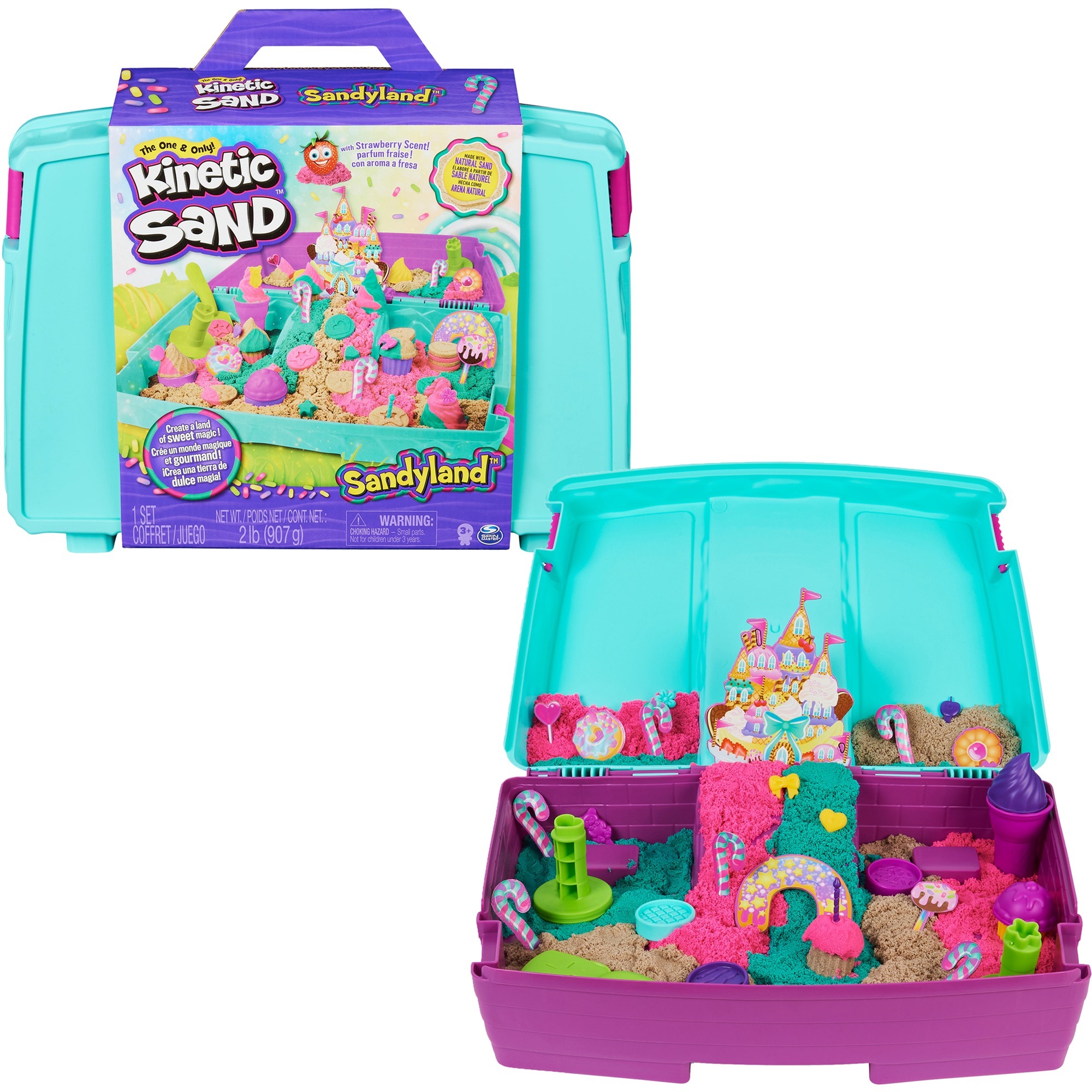 Kinetic Sand apre un mondo di giochi con la sabbia indoor creativo e fantasioso: questa sabbia da gioco è malleabile e affascinante, scivola tra le mani e non si asciuga mai, quindi è pronta per giocare in qualsiasi momento. Poiché Kinetic Sand si attacca a se stessa, le mani rimangono pulite e anche la pulizia viene eseguita rapidamente. I piccoli fornai possono fare le cose in grande con la custodia Sandyland Sandland: qui possono ritagliare i biscotti, le tartellette e i dolci più belli a loro piacimento dall''originale Kinetic Sand in tre colori, modellarli e modellarli, decorarli, venderli e creare ancora e ancora nuovi mondi dolci. Con un totale di 907 g di Kinetic Sand, questo significa abbastanza "impasto" per creazioni fantasiose. La sabbia rosa profuma anche delicatamente di fragola e quindi ispira i sensi e l''immaginazione. Con gli accessori e gli elementi decorativi si possono decorare le opere d''arte da forno e si può creare una vera e propria terra di latte e miele. La custodia aperta offre molto spazio di gioco ed è pratica per riporre sabbia e accessori dopo aver giocato.